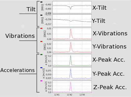 They measure both tilt directions at a rate of 100Hz. In standard operation they report every 15 seconds the average, lowest value and highest value to the central server system in the cloud.
